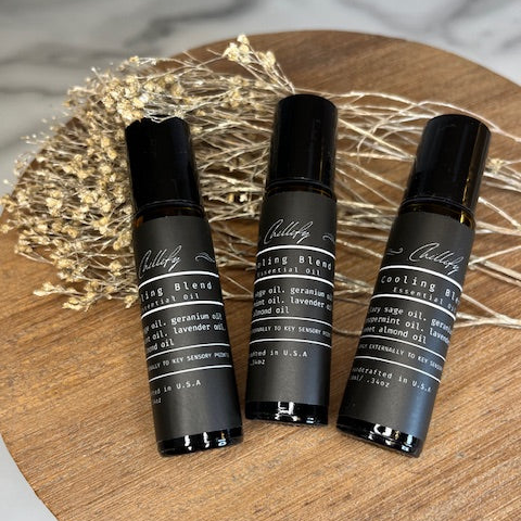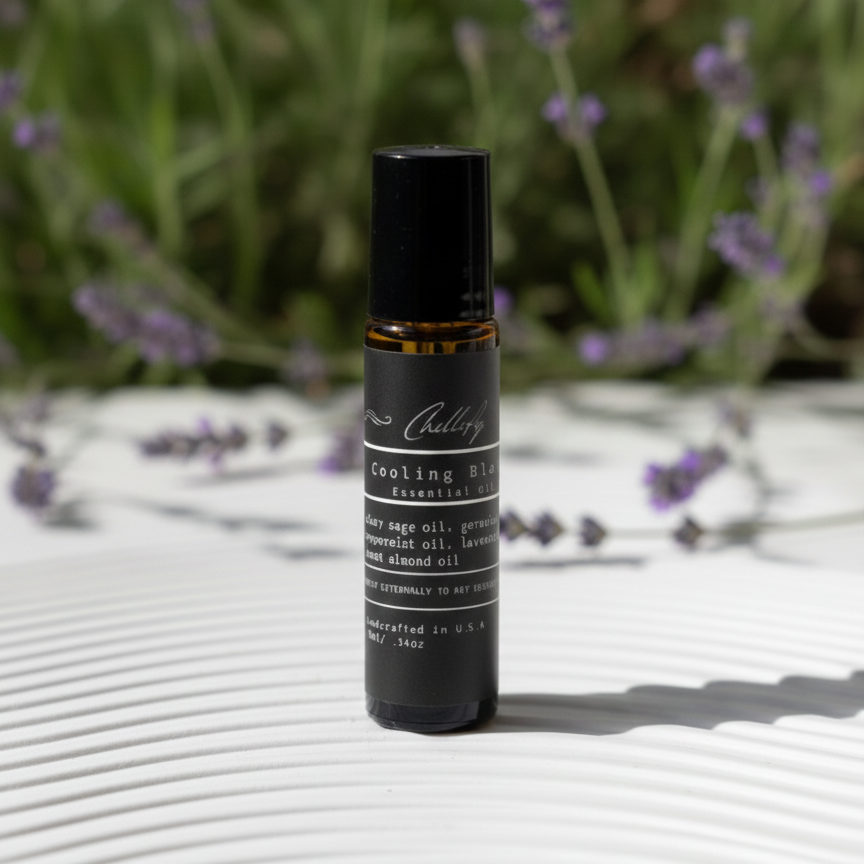 Chillify Cooling Blend is a specially formulated roll-on blend designed to soothe and refresh during moments of heat. Made with an organic mix of geranium, peppermint, lavender, sweet almond oil, and clary sage, it provides a cooling sensation while promoting relaxation.